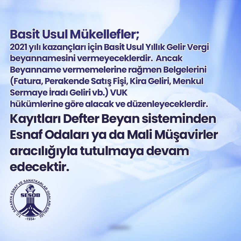 Basit Usul Mükellefler; 2021 yılı kazançları için Basit Usul Yıllık Gelir Vergi beyannamesini vermeyeceklerdir.  Ancak Beyanname vermemelerine rağmen Belgelerini (Fatura, Perakende Satış Fişi vb.) VUK hükümlerine göre alacak ve düzenleyeceklerdir. Kayıtları Defter Beyan sisteminden Esnaf Odaları ya da Mali müşavirler aracılığıyla tutulmaya devam edecektir.